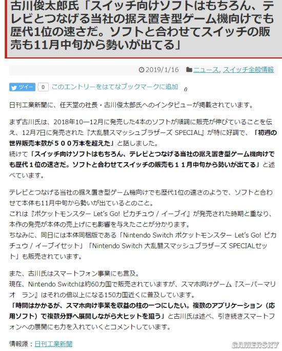 古川表示,12月7日发售的《任天堂明星大乱斗特别版》首周就卖出了500万套,Switch还是任天堂家用主机的销售速度NO.1,伴随着游戏推出,Switch从11月中旬开始销量大增,这个时间点和《精灵宝可梦 Let's Go!》的发售刚好重合,游戏的发售对NS的大卖有不小的影响,游戏发售当日还都推出了同捆版NS。