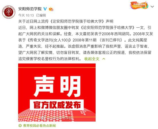 原标题:安阳师范学院强于哈佛大学?官方:纯属捏造,严重失实!